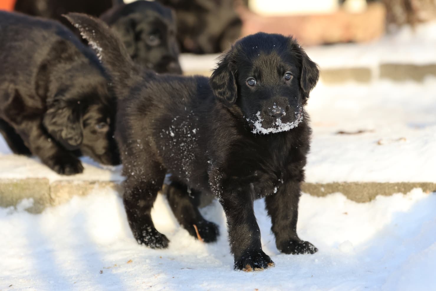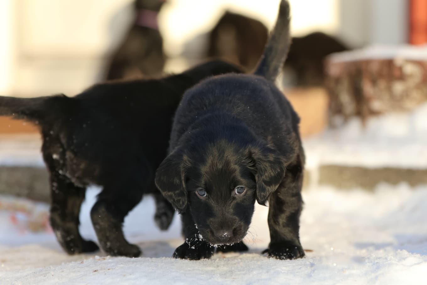 Tällä viikolla ulkoiltiin ensimmäisen kerran, vaikka pakkasta on ollut reilusti. Ulkoilut on lyhyitä, ja pennut on kyllä hyvin alkaneet tehdä tarpeet pihalle heti sinne tultuamme. Uskoisin, että sisäsiisteyshommat saadaan paremmalle alulle kuin Tuksun kesäpentueen kanssa.