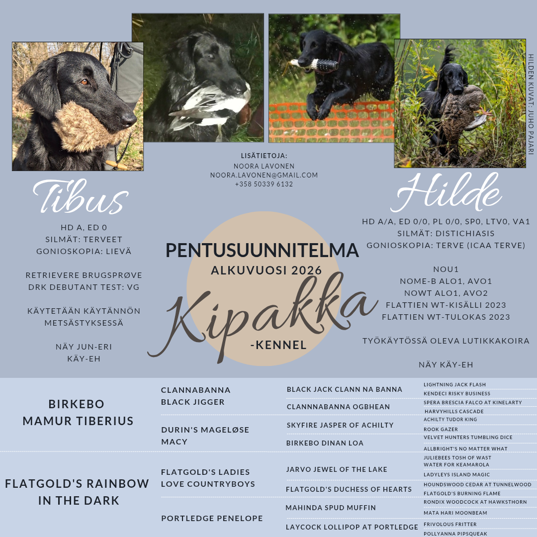 Hildelle (Flatgold's Rainbow in the Dark) on suunnitteilla pentue syksyn 2025 juoksuun. Uroksena on tanskalainen Tibus (Birkebo Mamur Tiberius). Suunnitelmia voit seurata täältä.